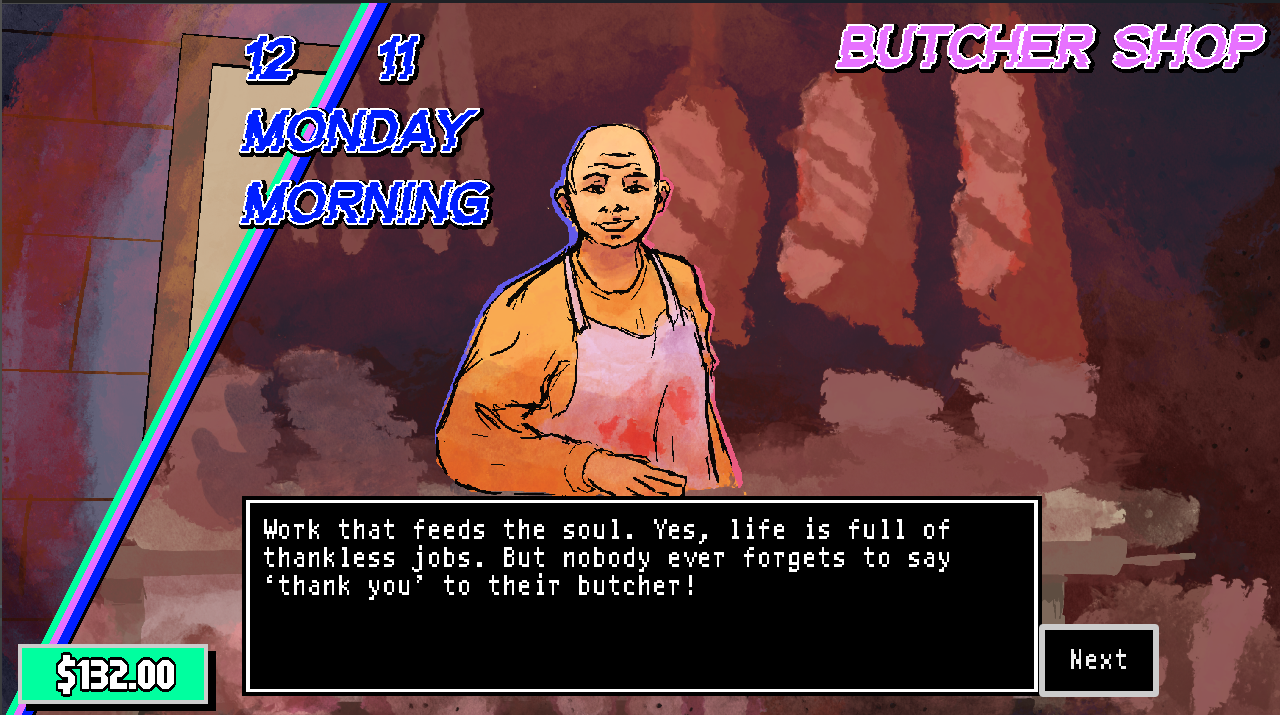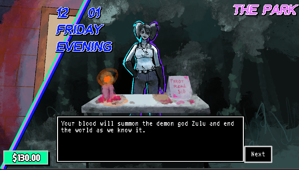 Annihilation Party is a detective visual novel game created for Acerola Jam 0. You play as a detective searching for ‘aberrants’: people infected with a mind virus that hides in their unconscious mind. The aberrant virus will fully bloom by New Years, giving you 31 days to get close to the suspect, gain a measure of their daily activities and look for inconsistencies in their behavior.