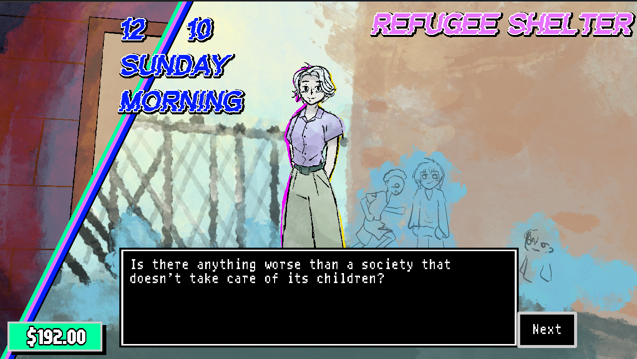 I went in a lot of new directions for this one — hand-drawn art style, no character controller, heavy emphasis on dialogue and story. I created all the programming, art, dialogue, and music for this game.